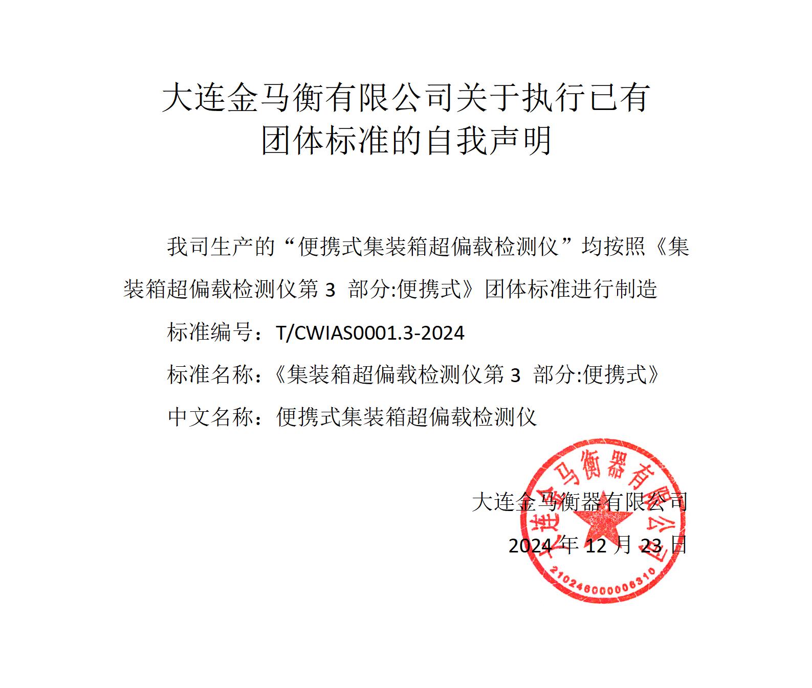 【聲明】大連金馬衡有限公司關于執行已有團體標準的自我聲明